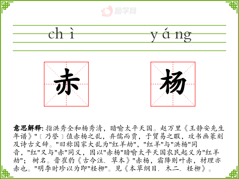 指洪秀全和杨秀清,暗喻太平天国。赵万里《王静安先生年谱》"﹝乃誉﹞值赤杨之乱,弃儒而贾,于贸易之暇,攻书画篆刻及诗古文辞。"旧称国家大乱为"红羊劫","红羊"与"洪杨"同音,"红"又与"赤"同义,因以"赤杨"暗喻太平天国农民起义为"红羊劫"; 树名。晋崔豹《古今注.草本》"赤杨,霜降则叶赤,材理亦赤也。"明李时珍以为即"柽柳"。见《本草纲目.木二.柽柳》。