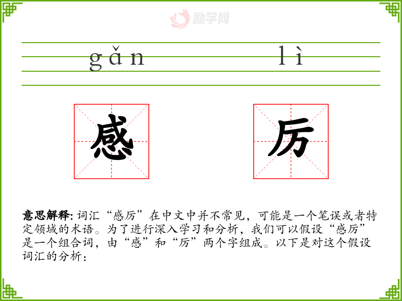 词汇“感厉”在中文中并不常见,可能是一个笔误或者特定领域的术语。为了进行深入学*和分析,我们可以假设“感厉”是一个组合词,由“感”和“厉”两个字组成。以下是对这个假设词汇的分析: