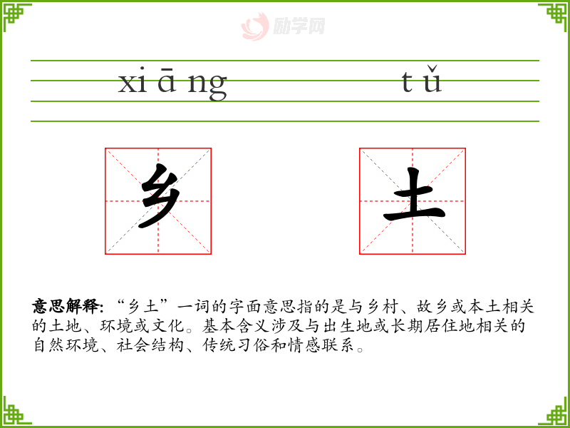 结合图片,可以想象一幅描绘乡村风光的画作,或是播放一段乡村音乐,如民谣,来增强“乡土”的视觉和听觉联想。