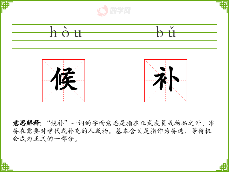 - 专业领域:在体育、政治、教育等专业领域,“候补”特指那些准备在正式成员无法履行职责时接替的人。