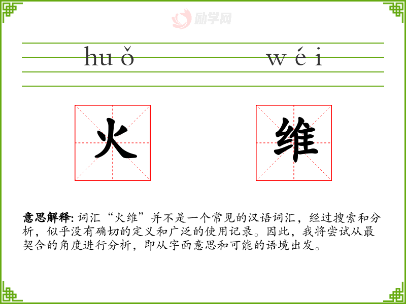 词汇“火维”并不是一个常见的汉语词汇,经过搜索和分析,似乎没有确切的定义和广泛的使用记录。因此,我将尝试从最契合的角度进行分析,即从字面意思和可能的语境出发。