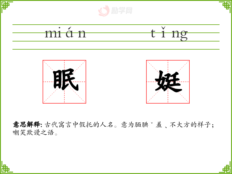 眠娗的意思是:古代寓言中假托的人名。意为腼腆ˇ羞﹑不大方的样子; 嘲笑欺谩之语。