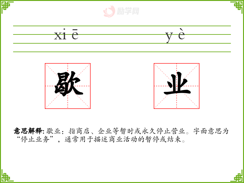 歇业:指商店、企业等暂时或永久停止营业。字面意思为“停止业务”,通常用于描述商业活动的暂停或结束。