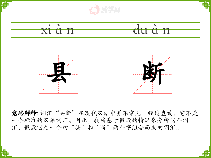词汇“县断”在现代汉语中并不常见,经过查询,它不是一个标准的汉语词汇。因此,我将基于假设的情况来分析这个词汇,假设它是一个由“县”和“断”两个字组合而成的词汇。