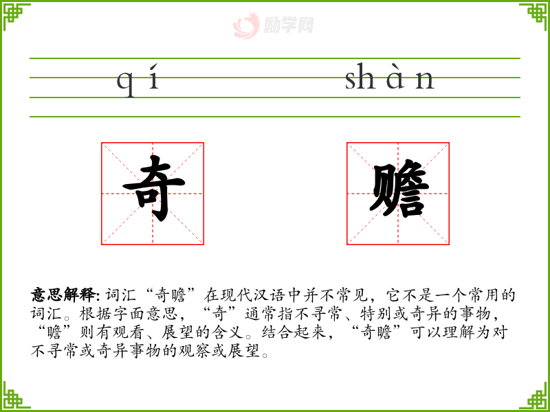 词汇“奇瞻”在现代汉语中并不常见,它不是一个常用的词汇。根据字面意思,“奇”通常指不寻常、特别或奇异的事物,“瞻”则有观看、展望的含义。结合起来,“奇瞻”可以理解为对不寻常或奇异事物的观察或展望。