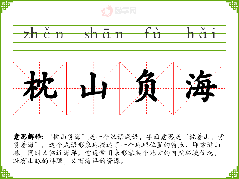 “枕山负海”这个成语不仅丰富了汉语的表达,也反映了人们对自然环境的向往和赞美。在我的语言学*和表达中,理解和运用这样的成语能够增强我的语言表现力和文化理解力。