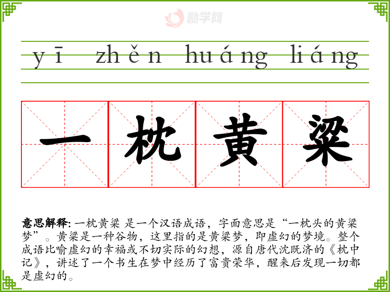 一枕黄粱 是一个汉语成语,字面意思是“一枕头的黄粱梦”。黄粱是一种谷物,这里指的是黄粱梦,即虚幻的梦境。整个成语比喻虚幻的幸福或不切实际的幻想,源自唐代沈既济的《枕中记》,讲述了一个书生在梦中经历了富贵荣华,醒来后发现一切都是虚幻的。