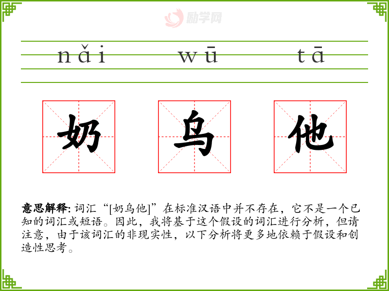 由于“[奶乌他]”不是一个实际存在的词汇,我们可以假设它是一个新造词或方言词汇。假设它是一个形容词,可能用来描述某种状态或性质。