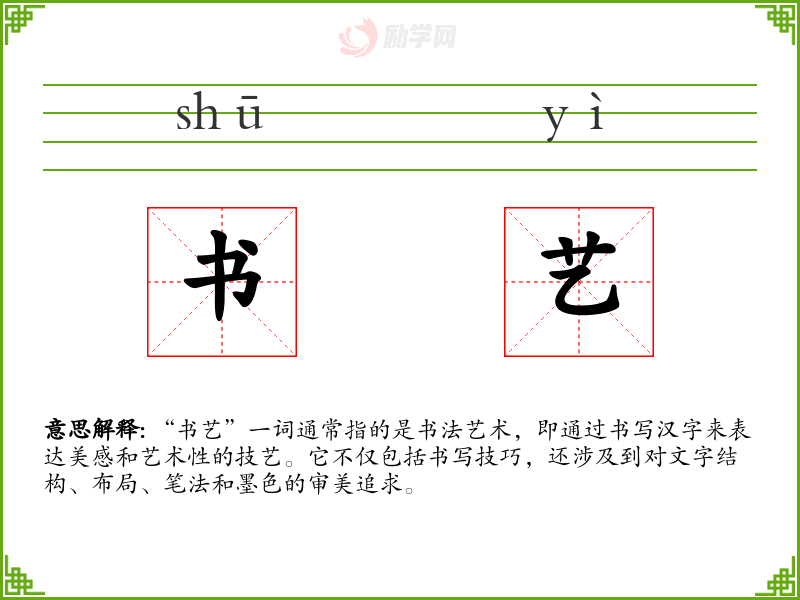 - 反义词:无(因为“书艺”是一个正面的艺术概念,通常不与负面词汇相对)
