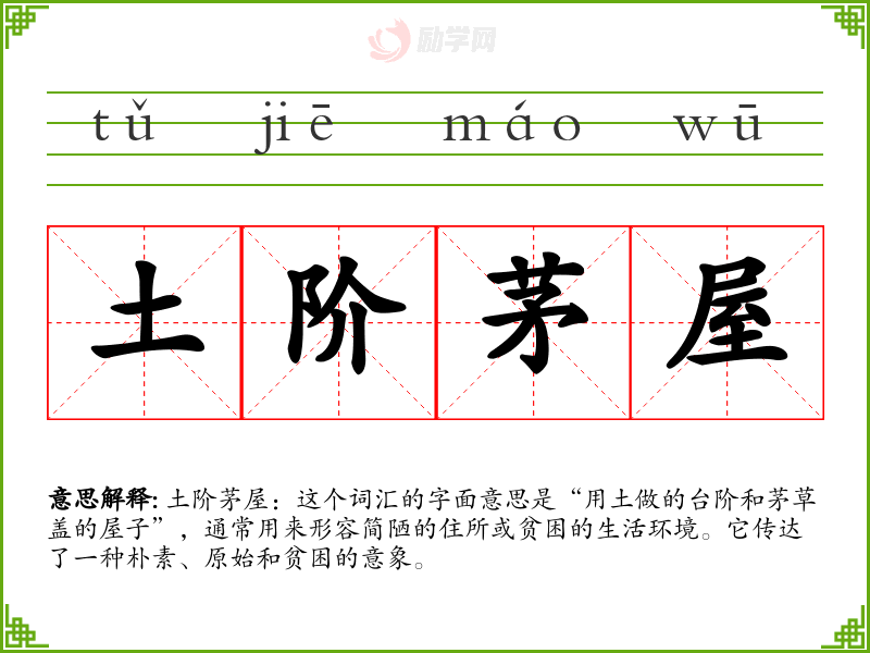 词源:这个词汇由“土阶”和“茅屋”两个词组成,“土阶”指的是用土做的台阶,“茅屋”是用茅草盖的屋子。