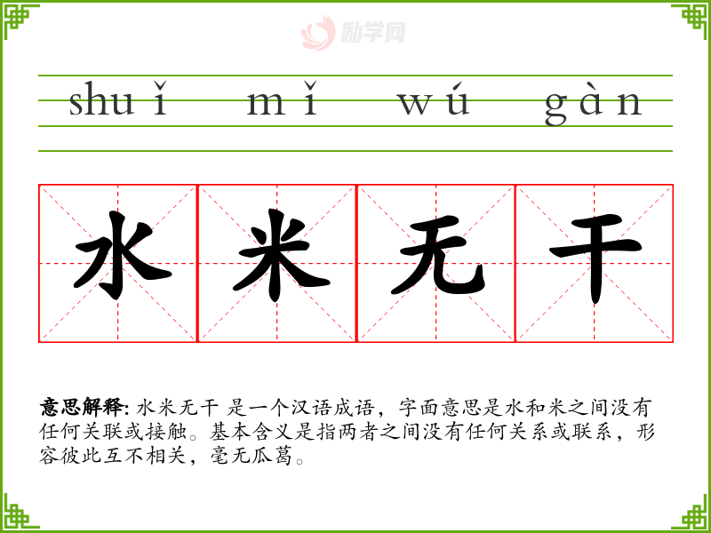 水米无干 是一个汉语成语,字面意思是水和米之间没有任何关联或接触。基本含义是指两者之间没有任何关系或联系,形容彼此互不相关,毫无瓜葛。