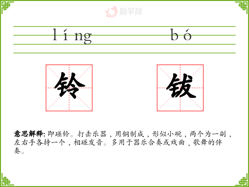 铃钹的意思是:即碰铃。打击乐器﹐用铜制成﹐形似小碗﹐两个为一副﹐左右手各持一个﹐相碰发音。多用于器乐合奏或戏曲﹑歌舞的伴奏。