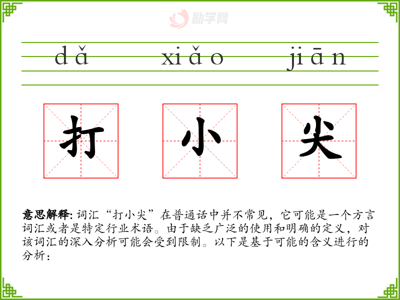词汇“打小尖”在普通话中并不常见,它可能是一个方言词汇或者是特定行业术语。由于缺乏广泛的使用和明确的定义,对该词汇的深入分析可能会受到限制。以下是基于可能的含义进行的分析: