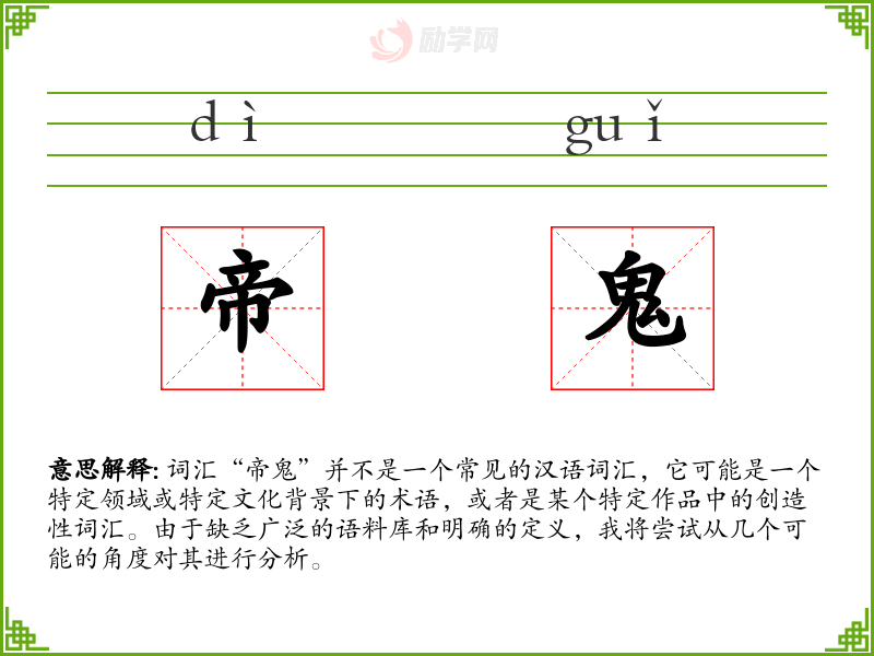 由于“帝鬼”不是一个标准词汇,它的使用可能局限于特定的文学作品、游戏、动漫或其他创意媒体中。在这些语境中,它可能用来描述一个具有帝王气质的鬼魂,或者是一个在鬼魂世界中拥有统治地位的存在。