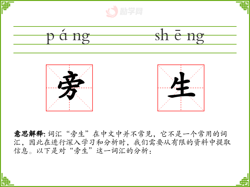 词汇“旁生”在中文中并不常见,它不是一个常用的词汇,因此在进行深入学*和分析时,我们需要从有限的资料中提取信息。以下是对“旁生”这一词汇的分析:
