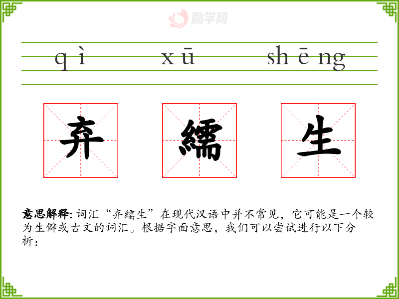 词汇“弃繻生”在现代汉语中并不常见,它可能是一个较为生僻或古文的词汇。根据字面意思,我们可以尝试进行以下分析: