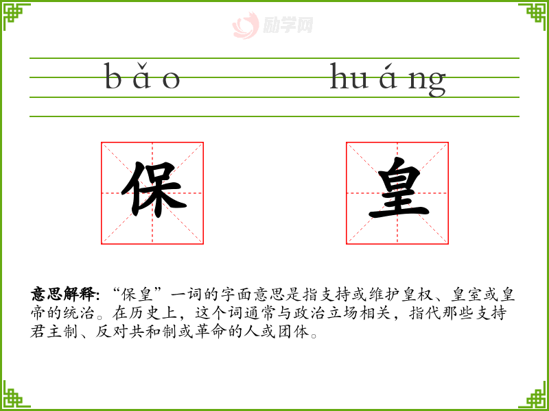 在文学中,“保皇”可能出现在描述历史**或政治斗争的文本中,用以描绘特定人物或群体的立场。在口语中,这个词可能带有贬义,指代那些顽固不化、拒绝变革的人。在专业领域,如历史学或政治学,“保皇”可能被用作学术讨论的术语,探讨不同历史时期的政治动态。
