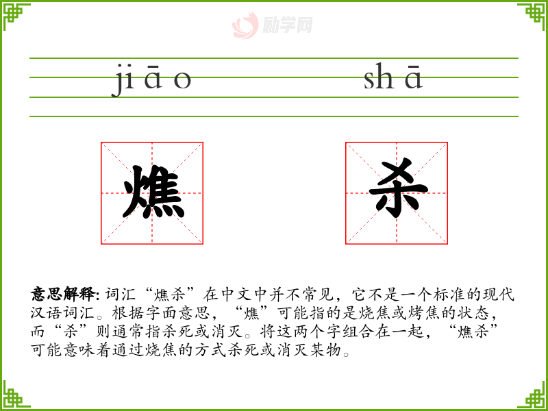 词汇“燋杀”在中文中并不常见,它不是一个标准的现代汉语词汇。根据字面意思,“燋”可能指的是烧焦或烤焦的状态,而“杀”则通常指杀死或消灭。将这两个字组合在一起,“燋杀”可能意味着通过烧焦的方式杀死或消灭某物。