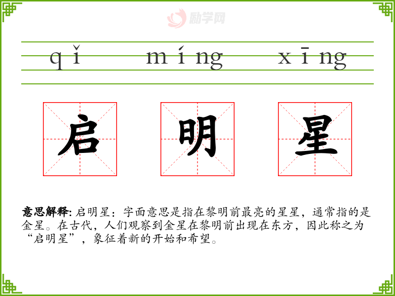 启明星:字面意思是指在黎明前最亮的星星,通常指的是金星。在古代,人们观察到金星在黎明前出现在东方,因此称之为“启明星”,象征着新的开始和希望。