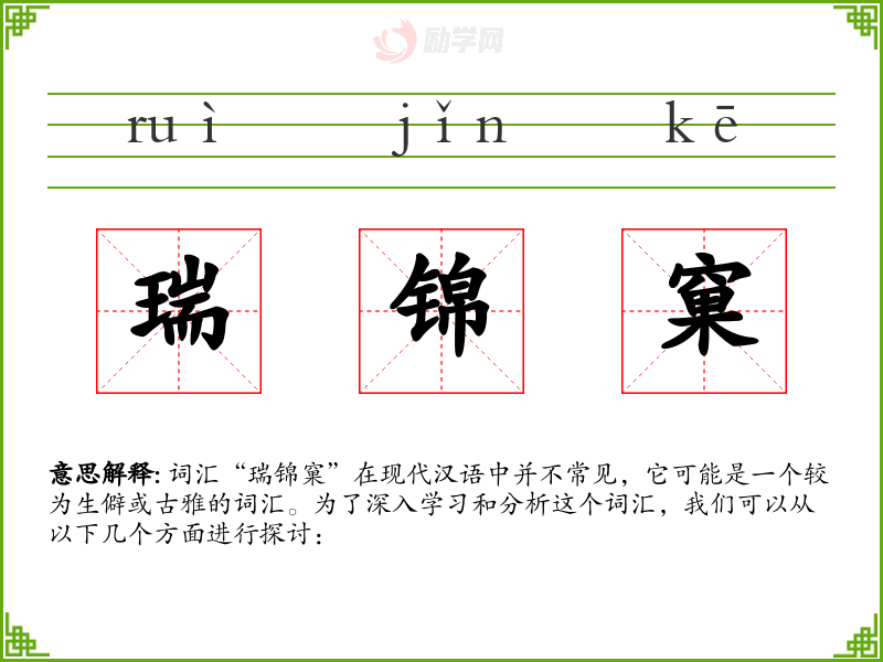 词汇“瑞锦窠”在现代汉语中并不常见,它可能是一个较为生僻或古雅的词汇。为了深入学*和分析这个词汇,我们可以从以下几个方面进行探讨: