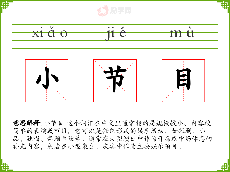 小节目 这个词汇在中文里通常指的是规模较小、内容较简单的表演或节目。它可以是任何形式的娱乐活动,如短剧、小品、独唱、舞蹈片段等,通常在大型演出中作为开场或中场休息的补充内容,或者在小型聚会、庆典中作为主要娱乐项目。