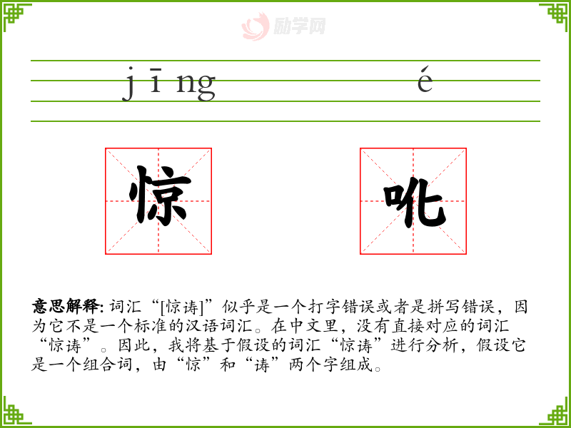 词汇“[惊诪]”似乎是一个打字错误或者是拼写错误,因为它不是一个标准的汉语词汇。在中文里,没有直接对应的词汇“惊诪”。因此,我将基于假设的词汇“惊诪”进行分析,假设它是一个组合词,由“惊”和“诪”两个字组成。