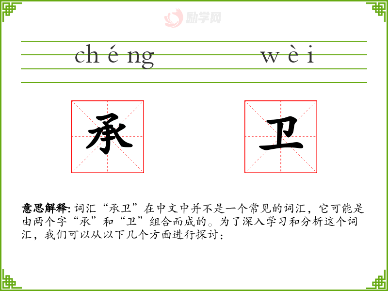 词汇“承卫”在中文中并不是一个常见的词汇,它可能是由两个字“承”和“卫”组合而成的。为了深入学习和分析这个词汇,我们可以从以下几个方面进行探讨: