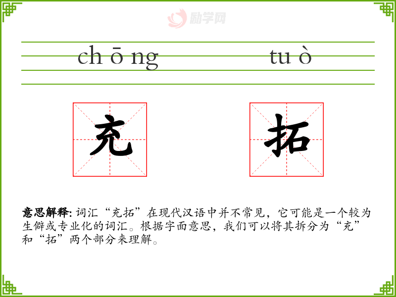 词汇“充拓”在现代汉语中并不常见,它可能是一个较为生僻或专业化的词汇。根据字面意思,我们可以将其拆分为“充”和“拓”两个部分来理解。