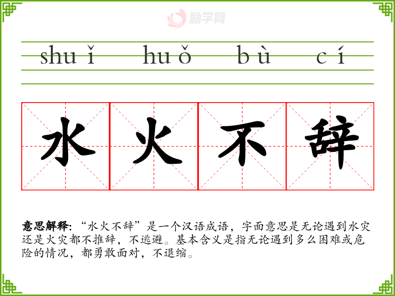 “水火不辞”是一个汉语成语,字面意思是无论遇到水灾还是火灾都不推辞,不逃避。基本含义是指无论遇到多么困难或危险的情况,都勇敢面对,不退缩。