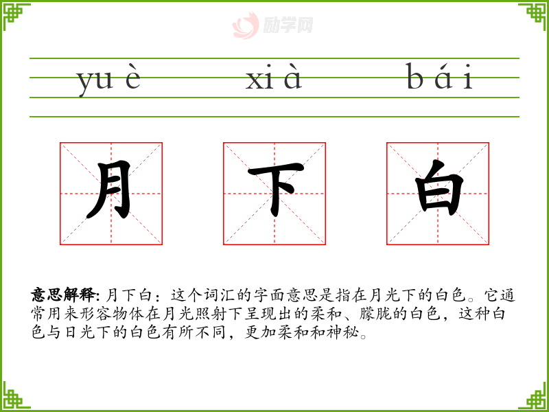 月下白:这个词汇的字面意思是指在月光下的白色。它通常用来形容物体在月光照射下呈现出的柔和、朦胧的白色,这种白色与日光下的白色有所不同,更加柔和和神秘。
