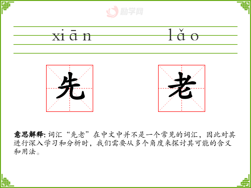 词汇“先老”在中文中并不是一个常见的词汇,因此对其进行深入学习和分析时,我们需要从多个角度来探讨其可能的含义和用法。