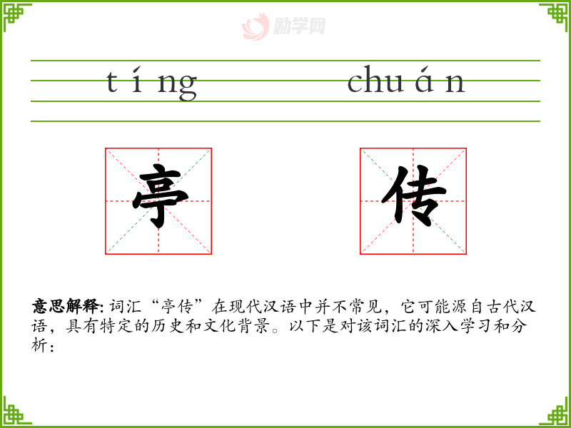 词汇“亭传”在现代汉语中并不常见,它可能源自古代汉语,具有特定的历史和文化背景。以下是对该词汇的深入学*和分析: