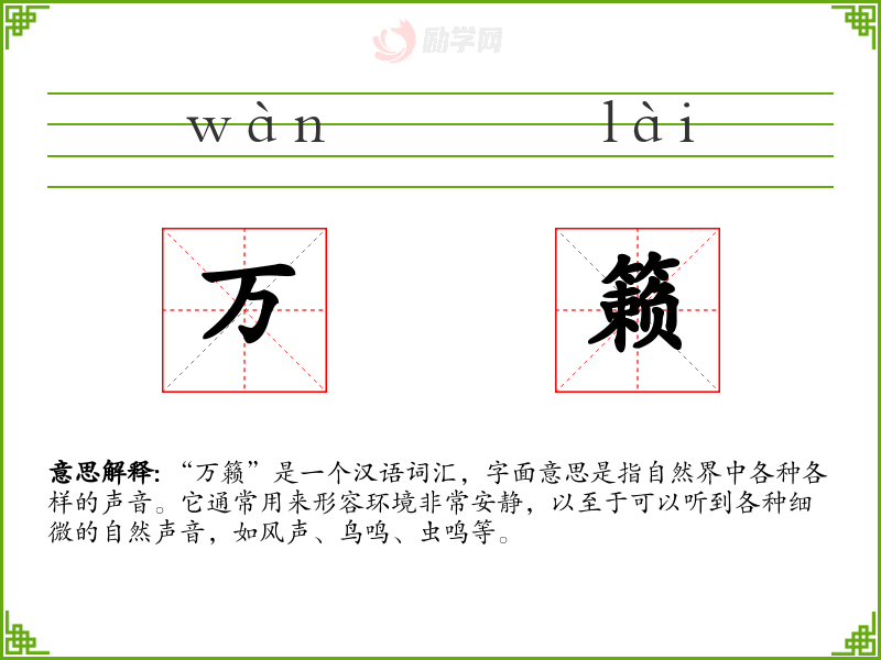 万籁的意思是:各种声音(籁:从孔穴里发出的声音):~俱寂。