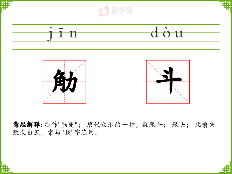 觔斗的意思是:亦作"觔兜"; 唐代散乐的一种。翻跟斗; 跟头; 比喻失败或出丑。常与"栽"字连用。