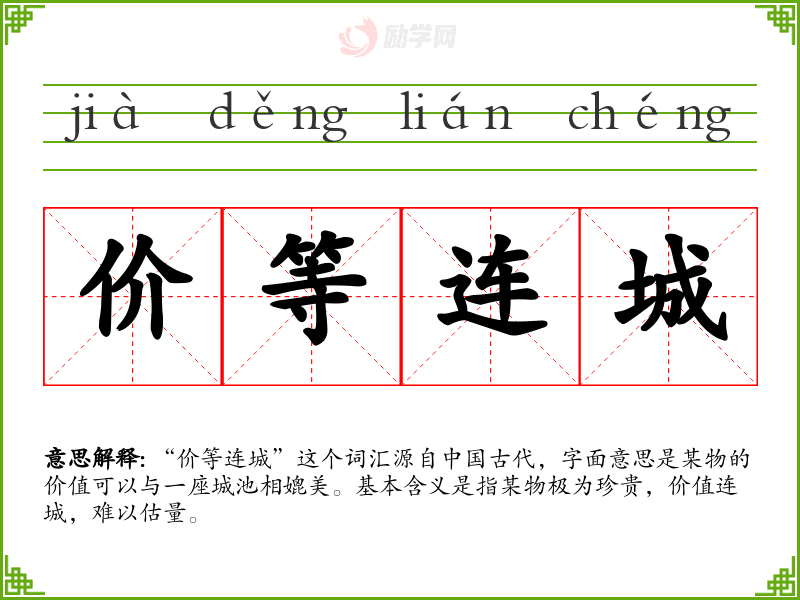 “价等连城”这个词汇源自**古代,字面意思是某物的价值可以与一座城池相媲美。基本含义是指某物极为珍贵,价值连城,难以估量。