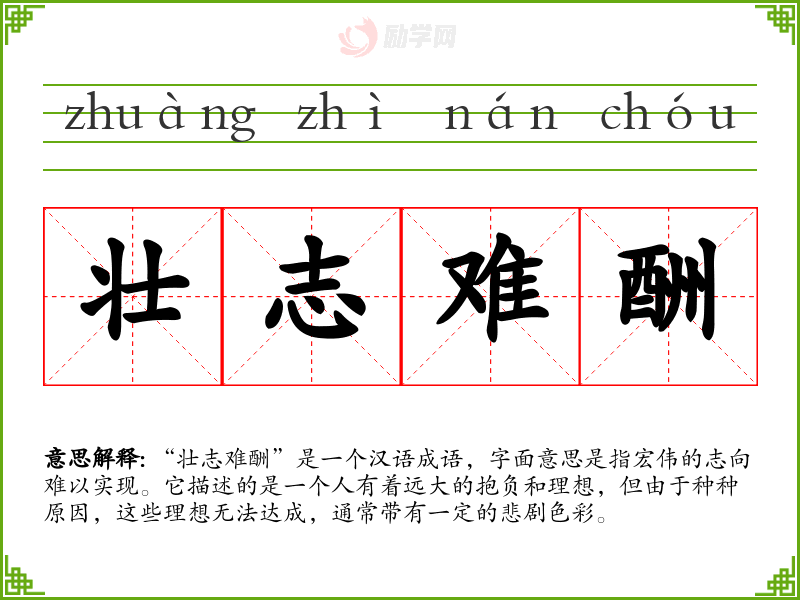 “壮志难酬”是一个汉语成语,字面意思是指宏伟的志向难以实现。它描述的是一个人有着远大的抱负和理想,但由于种种原因,这些理想无法达成,通常带有一定的悲剧色彩。