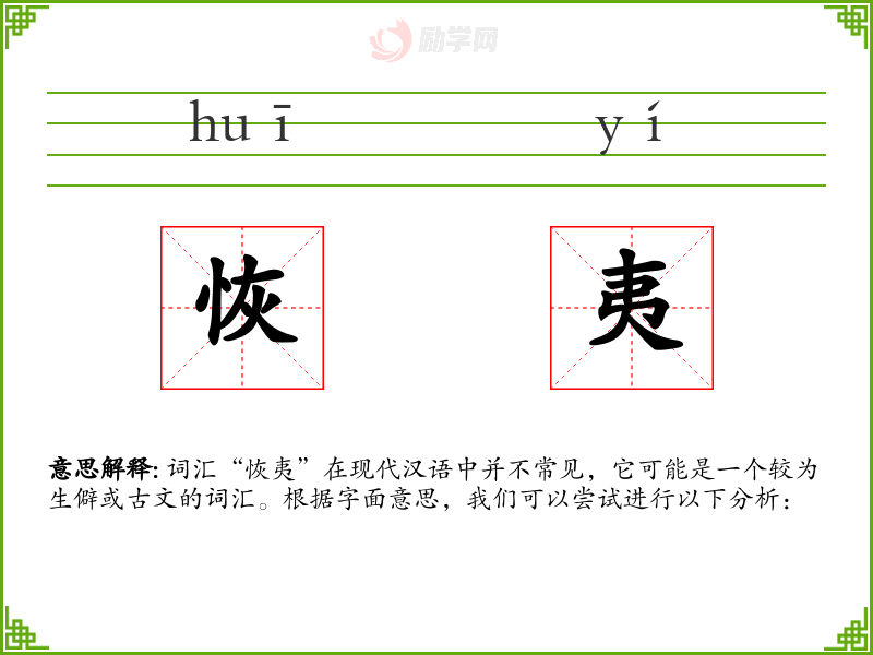 词汇“恢夷”在现代汉语中并不常见,它可能是一个较为生僻或古文的词汇。根据字面意思,我们可以尝试进行以下分析: