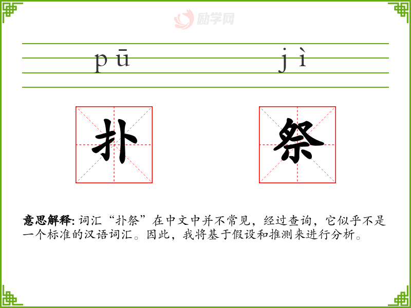 词汇“扑祭”在中文中并不常见,经过查询,它似乎不是一个标准的汉语词汇。因此,我将基于假设和推测来进行分析。