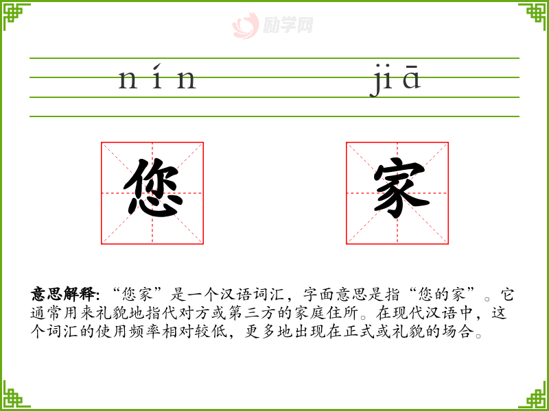 - 专业领域:在某些专业领域,如服务行业或官方文件中,可能会使用“您家”来表达对客户的尊重。