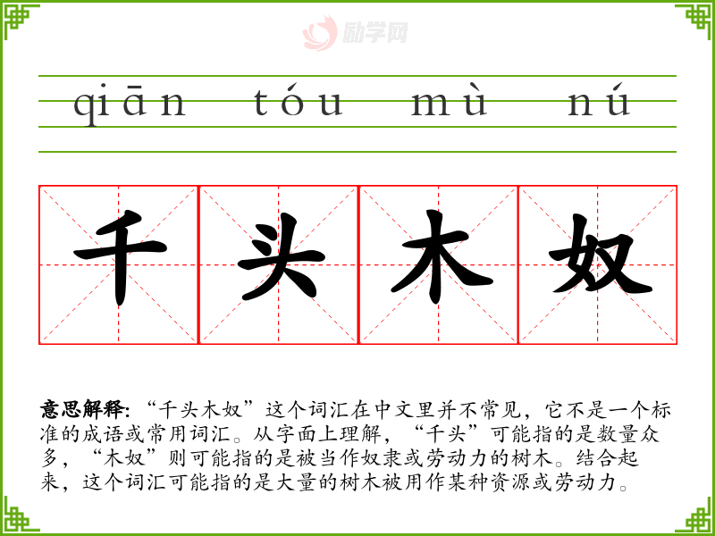 “千头木奴”这个词汇在中文里并不常见,它不是一个标准的成语或常用词汇。从字面上理解,“千头”可能指的是数量众多,“木奴”则可能指的是被当作奴隶或劳动力的树木。结合起来,这个词汇可能指的是大量的树木被用作某种资源或劳动力。