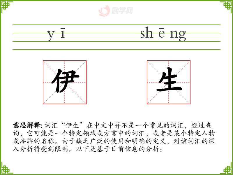 综上所述,由于“伊生”不是一个标准的中文词汇,对其进行深入分析存在困难。在语言学习中,建议关注和学习那些具有明确定义和广泛使用的词汇。