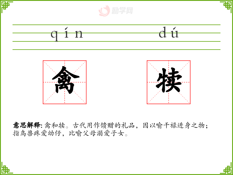 禽犊的意思是:禽和犊。古代用作馈赠的礼品,因以喻干禄进身之物; 指鸟兽疼爱幼仔,比喻父母溺爱子女。