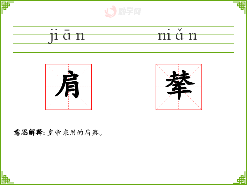 《说文》-肩,髆也。从肉,象形。 《尔雅》-北方有比肩之民焉。迭食而迭望。 《仪礼·少牢礼》-肩臂臑。 《庄子·养生主》-肩之所倚。 《徐霞客游记·游黄山记》-并肩手相接。