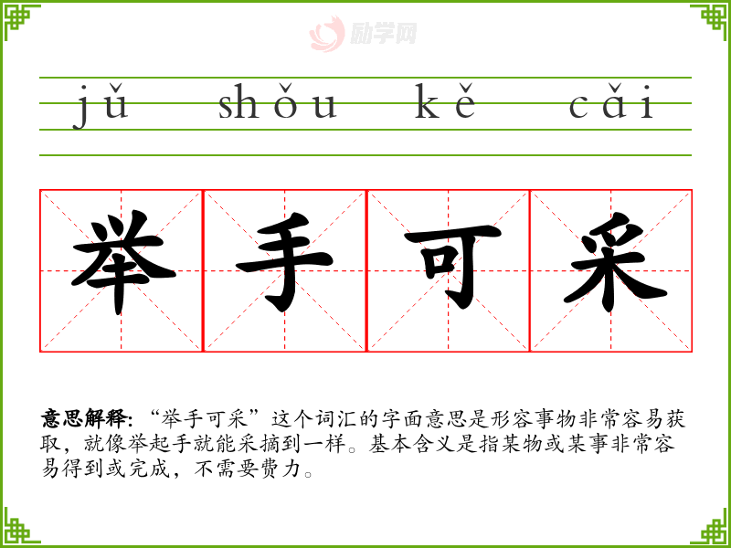 “举手可采”这个词汇的字面意思是形容事物非常容易获取,就像举起手就能采摘到一样。基本含义是指某物或某事非常容易得到或完成,不需要费力。