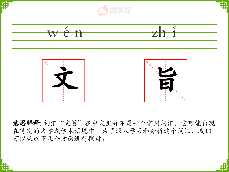 词汇“文旨”在中文里并不是一个常用词汇,它可能出现在特定的文学或学术语境中。为了深入学*和分析这个词汇,我们可以从以下几个方面进行探讨: