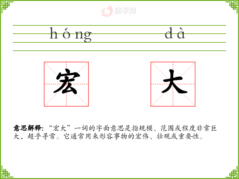 “宏大”一词的字面意思是指规模、范围或程度非常巨大,超乎寻常。它通常用来形容事物的宏伟、壮观或重要性。