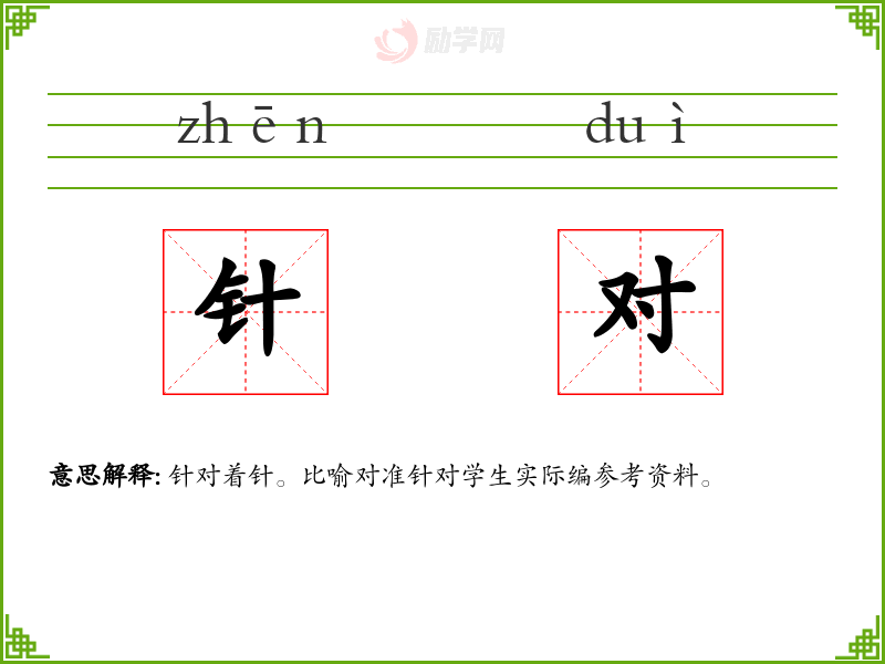 针对的意思是:针对着针。比喻对准针对学生实际编参考资料。