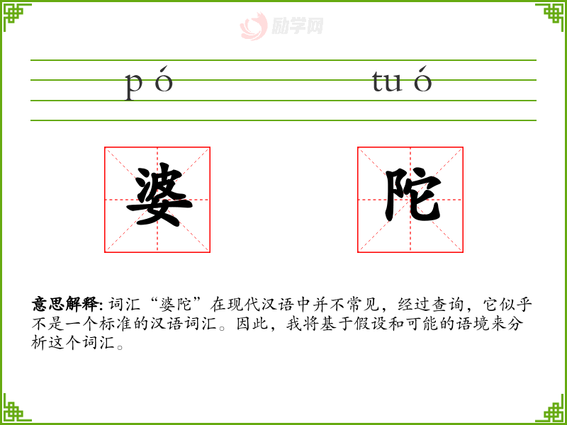 词汇“婆陀”在现代汉语中并不常见,经过查询,它似乎不是一个标准的汉语词汇。因此,我将基于假设和可能的语境来分析这个词汇。