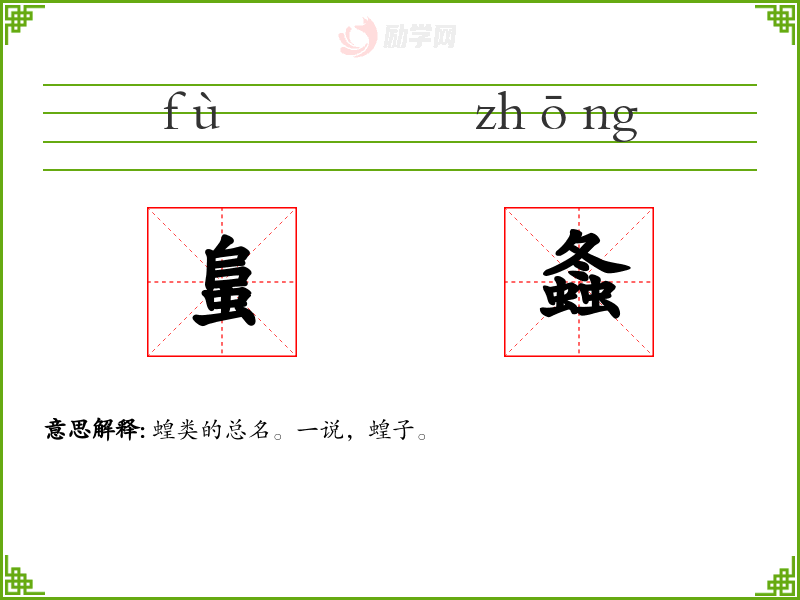 蛗[ fù ] 1. 〔~螽〕蚱蜢。 [更多解释]