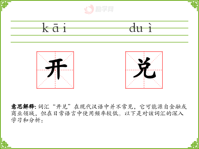 词汇“开兑”在现代汉语中并不常见,它可能源自金融或商业领域,但在日常语言中使用频率较低。以下是对该词汇的深入学习和分析: